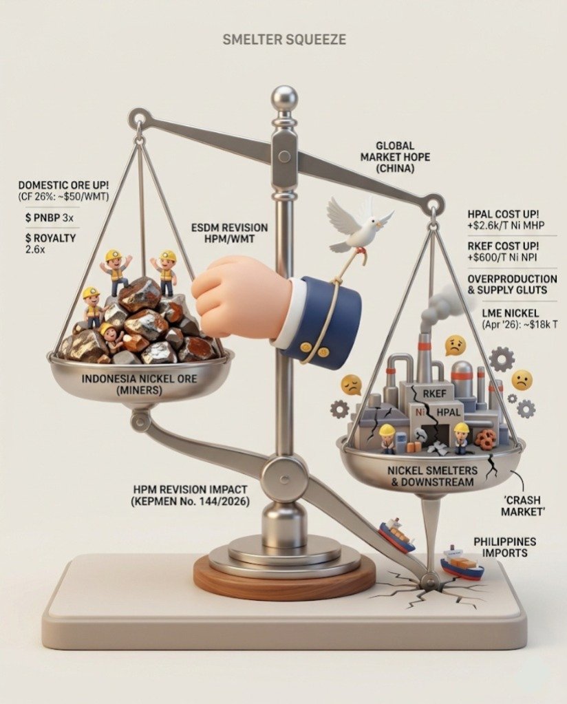 17 April, 2026 – Forum Industri Nikel Indonesia (FINI) menyatakan keberatan keras terhadap revisi Harga Patokan Mineral (HPM), memperingatkan bahwa lonjakan harga bijih domestik yang tiba-tiba ini melumpuhkan operasional smelter yang sudah tertekan oleh kondisi global. Menurut Ketua Umum FINI Arif Perdana Kusumah, kenaikan HPM sangat mengancam margin hilirisasi. Biaya produksi smelter RKEF diproyeksikan melonjak ~US$600/ton. Smelter HPAL menghadapi pukulan yang lebih telak: biaya produksi MHP akan melonjak US$2.400–US$2.600/ton. Ini memperparah krisis sulfur imbas konflik Timur Tengah, di mana harga sulfur telah meroket dari <US$100/ton menjadi US$250/ton, menambah beban biaya hingga US$4.000/ton pada operasional HPAL. Data Shanghai Metals Market (SMM) mengonfirmasi kekhawatiran ini, memprediksi HPM untuk bijih nikel kadar 1,2%…