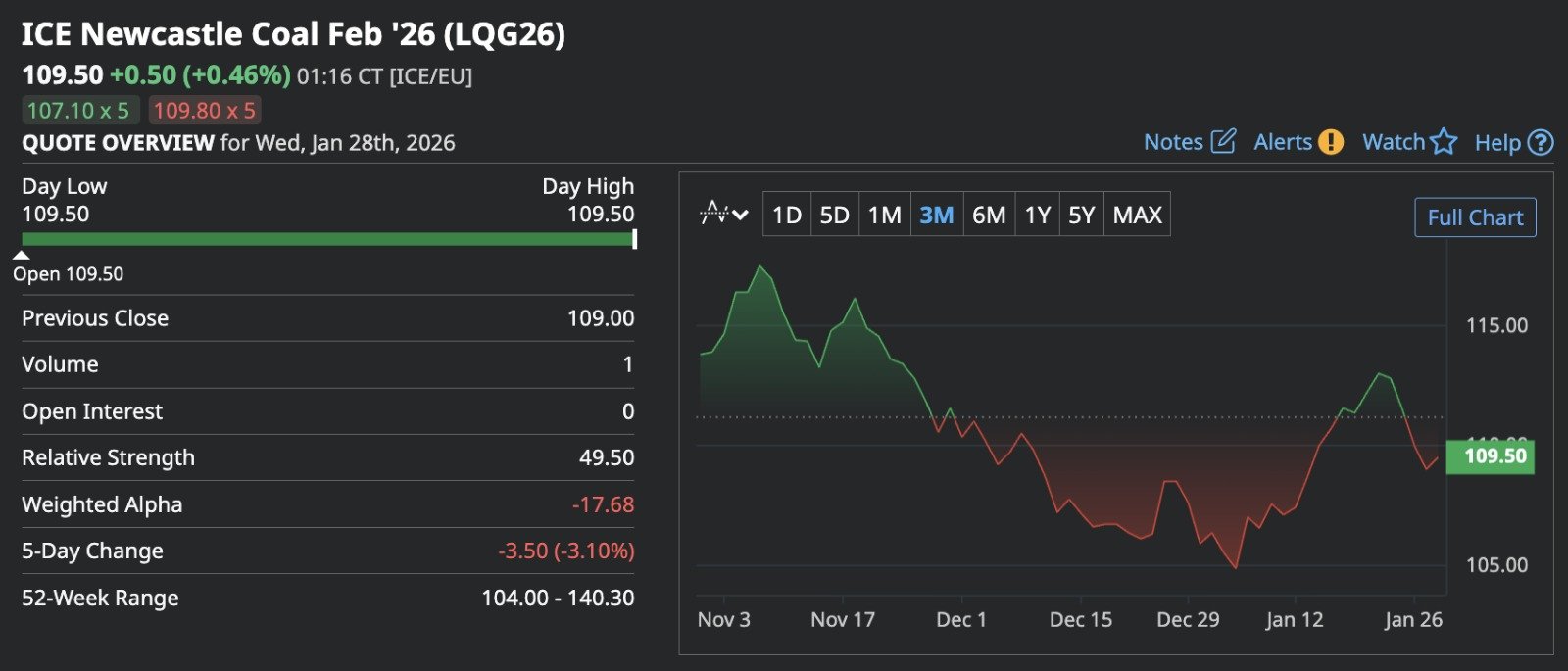CNBC— 28 Januari 2026 – Pasar batu bara global masih berjuang mencari pijakan di tengah tren penurunan mingguan. Pada perdagangan Rabu (28/1), kontrak berjangka ICE Newcastle untuk pengiriman Februari 2026 (LQG26) terpantau mencoba rebound tipis +0,46% ke level US$ 109,50 per ton, setelah sebelumnya ditutup di US$ 109,00. Meski ada sedikit penguatan hari ini, tren harga dalam lima hari terakhir masih mencatatkan koreksi sebesar 3,10%. Tekanan jual ini memperpanjang derita pasar yang sebelumnya sempat anjlok 1,35% ke posisi US$ 110 pada awal pekan.