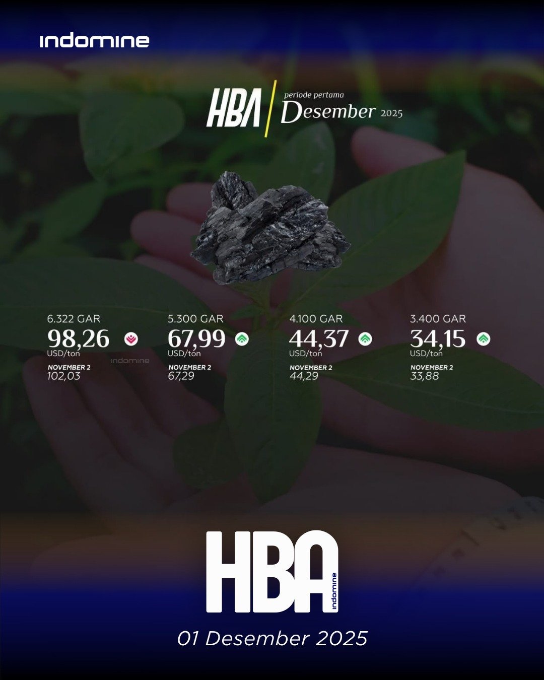 12 December 2025Indonesian Coal Index GAR 65 ICI 1 • $103.17 🔻-0.19GAR 58 ICI 2 • $ 80.88 🔻-0.46GAR 50 ICI 3 • $ 63.16 🔻-1.14GAR 42 ICI 4 • $ 46.73 🔻-1.11GAR 34 ICI 5 • $ 32.06 🔻-0.07 Follow Indomine • Coal & Nickel channel on WhatsApp: https://wa.me/channel/0029VaIecw6Ae5VszCiYdE2g