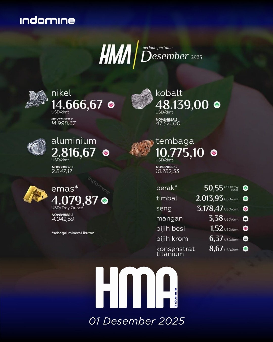 📆 01 DESEMBER 2025Indonesian Nickel Price IndexProduct 🚢 Price ↕️ —————————————-Nickel Ore 1.2% CIF • $22.00-$24.00 ↔️ 0.00Nickel Ore 1.6% CIF • $51.50-$53.50 ↔️ 0.00Nickel Pig Iron FOB • $109.61 🟢+0.03HG Nickel Matte FOB • $13,259.00 🟢+69.00MHP FOB • $12,979.00 🟢+68.00 📆 *December 2025 (1st)* *Indonesian Nickel Index* > *HMA* *`$14.666,67/dmt`* `🔻–332,00` > *HPM* *`Ni … Read more