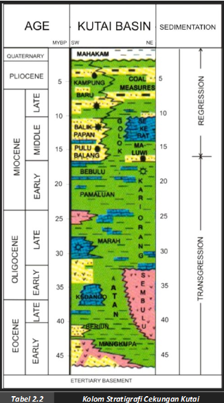 Satyana et all, 1999 dalam An Outline Of The Geology Of Indonesia, 2001 melakukan penelitian dan menyusun stratigrafi Cekungan Kutai dari tua ke muda sebagai berikut :