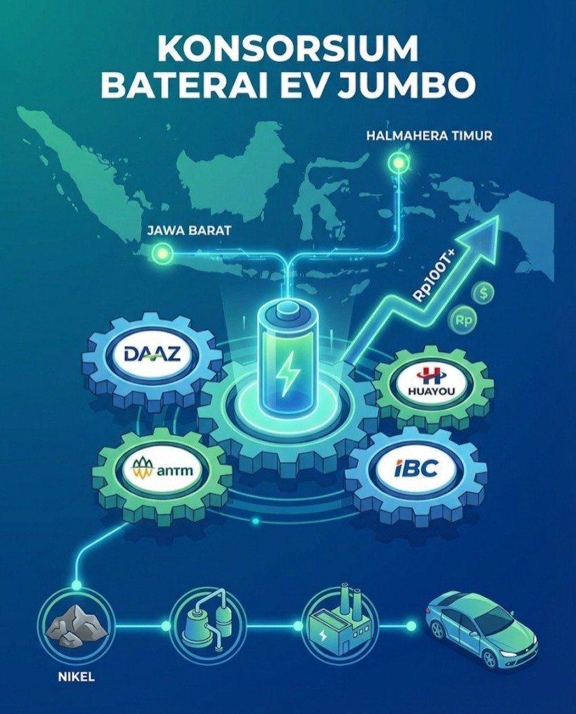 CNBC/Investing – 04 Februari 2026 – PT Daaz Bara Lestari Tbk DAAZ resmi berekspansi ke sektor hilirisasi nikel dengan bergabung dalam mega-proyek ekosistem baterai kendaraan listrik (EV) bersama PT Aneka Tambang Tbk ANTM dan PT Industri Baterai Indonesia (IBC). Melalui entitas anaknya, Daaz Nexus Energy Limited, perseroan masuk ke dalam konsorsium global HYD Investment Limited yang juga beranggotakan raksasa Tiongkok, Zhejiang Huayou Cobalt dan EVE Energy. Langkah strategis ini ditandai dengan penandatanganan Framework Agreement pada 30 Januari 2026.