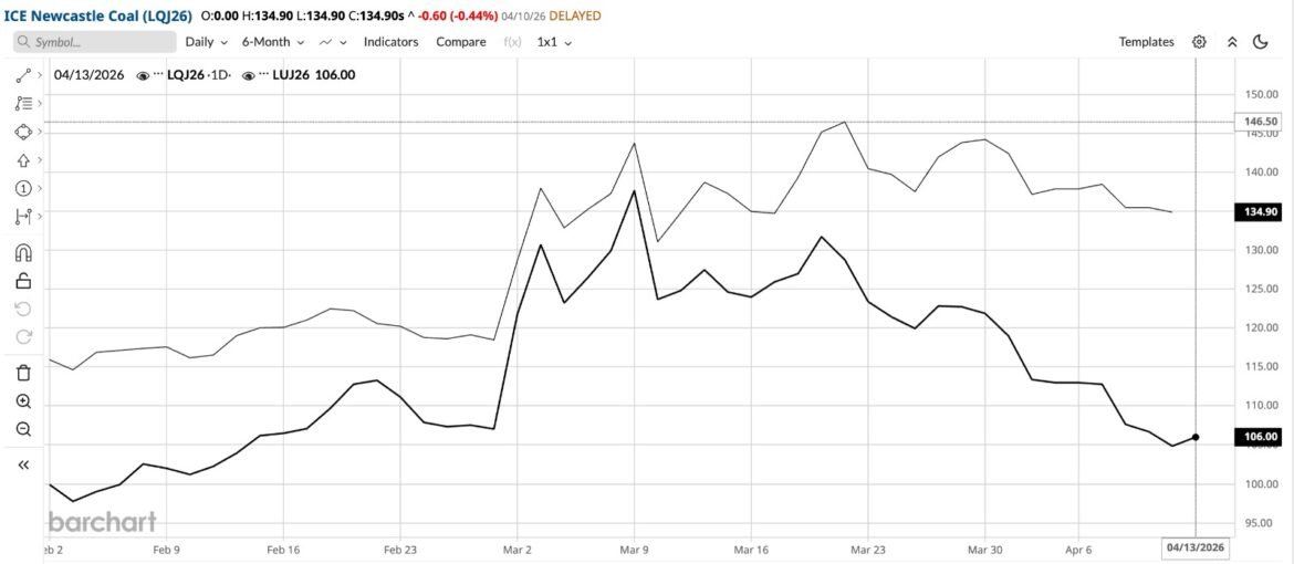 InvestorID – 13 April 2026 – Harga futures batu bara global bergerak mixed ketika pasar terus mencerna pelemahan ekspor Indonesia, perubahan kebijakan energi, dan ketidakpastian geopolitik yang masih tinggi. Berdasarkan layar ICE terbaru, Newcastle Coal Apr’26 turun ke US$134,90/ton, melemah US$0,60 atau 0,44% dari penutupan sebelumnya di US$135,50/ton. Struktur forward juga tidak seragam, dengan Mei 2026 di US$129,90/ton (-US$2,50), Juni 2026 di US$130,50/ton (-US$2,75), sementara Juli 2026 justru naik ke US$133,00/ton (+US$2,05). Sebaliknya, Rotterdam Coal Apr’26 naik ke US$106,00/ton, bertambah US$1,15 atau 1,10%, dengan Mei 2026 di US$107,30/ton (+US$1,55) dan Juni 2026 di US$112,00/ton (+US$3,50), menunjukkan sentimen yang lebih kuat di pasar Eropa.