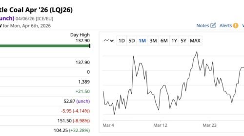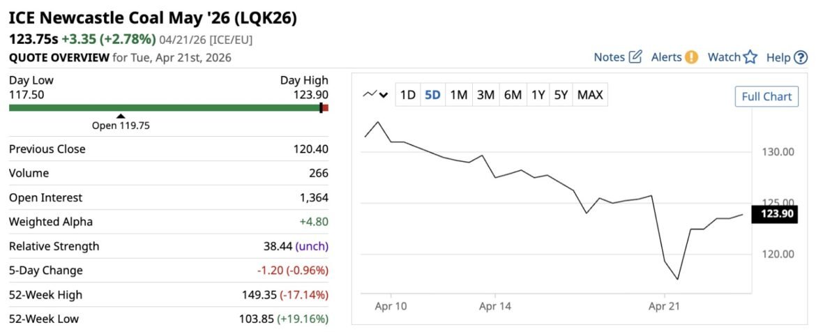- Koreksi Berbalik Arah: Setelah sempat ambruk, harga kontrak berjangka Batu Bara ICE Newcastle untuk April 2026 sedikit naik ke US$ 132,90 per ton, dan kontrak Mei 2026 menguat ke US$ 123,75 per ton pada perdagangan Selasa, 21 April. Setali tiga uang, kontrak Batu Bara ICE Rotterdam untuk April 2026 merangkak naik ke US$ 102,25 per ton dan Mei 2026 di US$101,50 per ton.