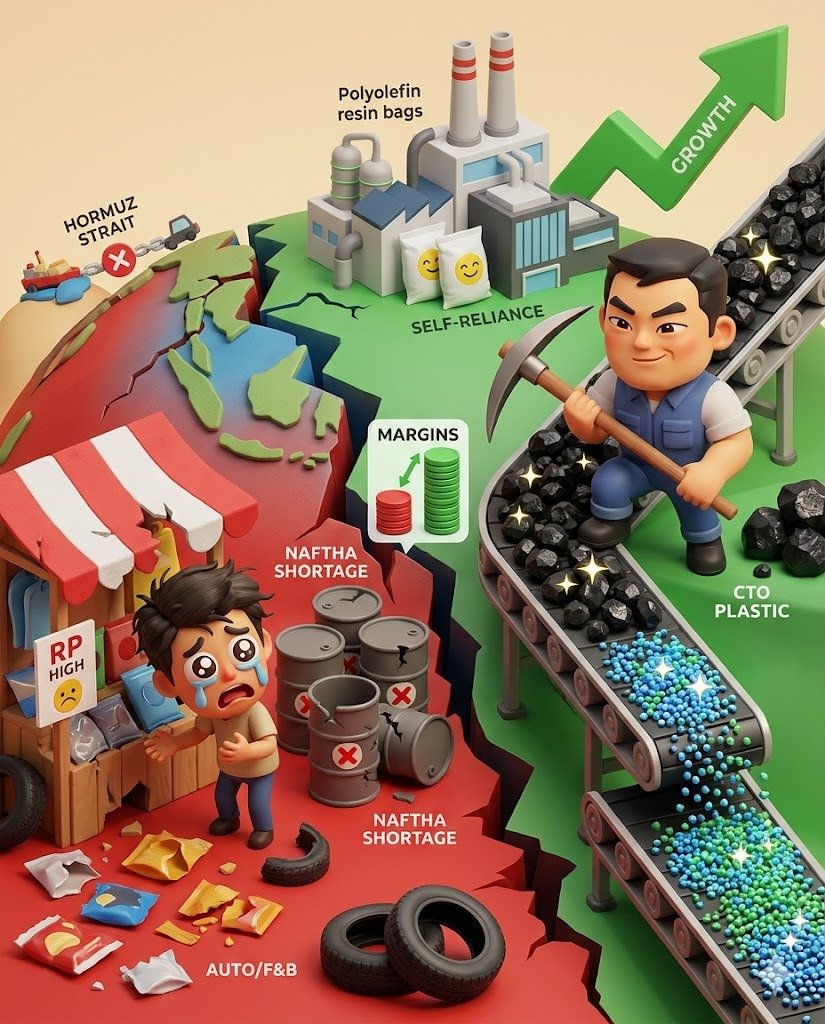 Sebaliknya, Tiongkok memanfaatkan guncangan pasokan minyak ini dengan mengekspansi infrastruktur Coal-to-Olefins (CTO) secara agresif. Memanfaatkan cadangan batu bara domestiknya yang melimpah, Tiongkok menggunakan teknologi CTO untuk mengubah batu bara melalui proses gasifikasi menjadi gas sintetis (syngas), memprosesnya menjadi metanol, dan kemudian mempolimerisasinya menjadi plastik dasar seperti etilen dan propilen tanpa bergantung pada minyak mentah impor. Dengan keunggulan margin batu bara atas minyak berada di titik terlebar sejak 2015, China Shenhua Energy Co. mengalihkan belanja modalnya untuk melipatgandakan kapasitas polietilen dan polipropilen berbasis CTO menjadi 1,4 juta ton pada 2027, mengamankan rantai pasok bahan kimia yang sangat menguntungkan dan mandiri.