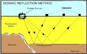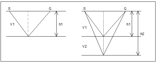 Sinyal yang dikirim melalui alat peledak (S) direfleksikan oleh bidang reflektor oleh titik refleksi (R), dan sinyal yang dipantulkan direkam oleh detektor berupa geofon (G). Jika h adalah ketebalan lapisan, maka waktu (t) yang dibutuhkan oleh sinyal untuk sampai ke detektor adalah :
