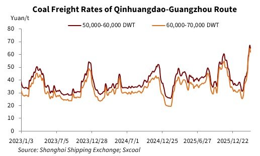 • Qinhuangdao → Guangzhou 50–60k DWT: 65 yuan/ton (+3,0 yuan/ton w/w)