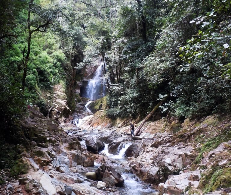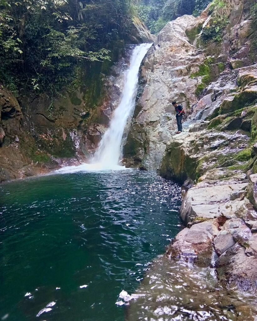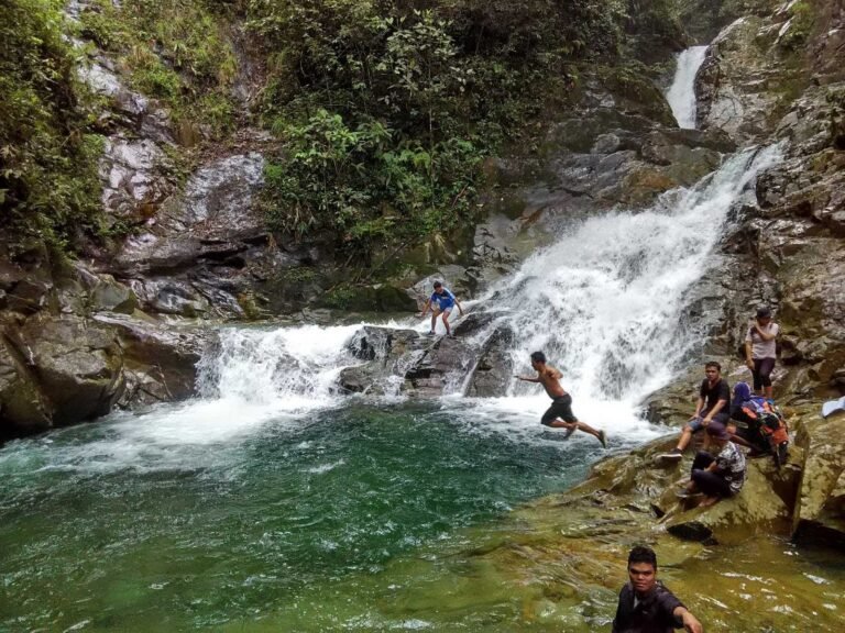 Untuk menuju lokasi air terjun perjalanan dilanjutkan dengan berjalana kaki selama kurang lebih satu atau dua jam melintasi jalur tracking dengan kondisi yang cukup berat. Disarankan anda menggunakan sepatu yang nyaman agar berjalan tidak terlalu melelahkan. Setelah melalui perjalanan yang berat Anda akan tiba di lokasi air terjun yang dikenal juga dengan nama Wisata Alam Pohon Damai. Jika Anda tidak ingin bermalam di lokasi air terjun sebaiknya perjalanan Anda dimulai sepagi mungkin agar bisa kembali sebelum matahari terbenam.