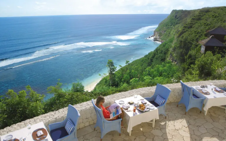 Letak lokasinya di tepi tebing, Di Mare Restaurant merupakan salah satu kafe yang terkenal menyuguhkan pemandangan langsung ke laut. Cukup dengan mengeluarkan uang mulai dari 120 ribu, berbagai varian menu dapat dipesan di restoran yang terletak dalam Resort Karma Kandara ini.