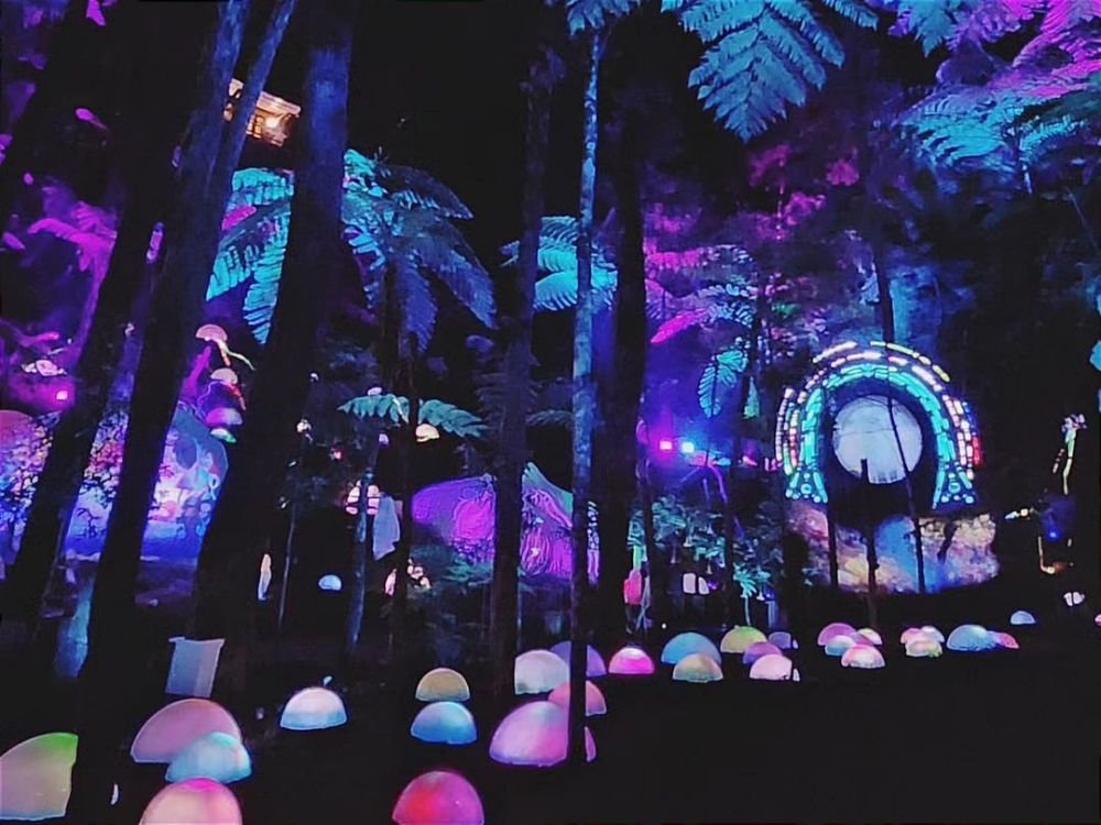 - Menikmati pemandangan pepohonan dan bebatuan yang diberi sentuhan cahaya lampu warna-warni yang menciptakan pengalaman visual yang menakjubkan.