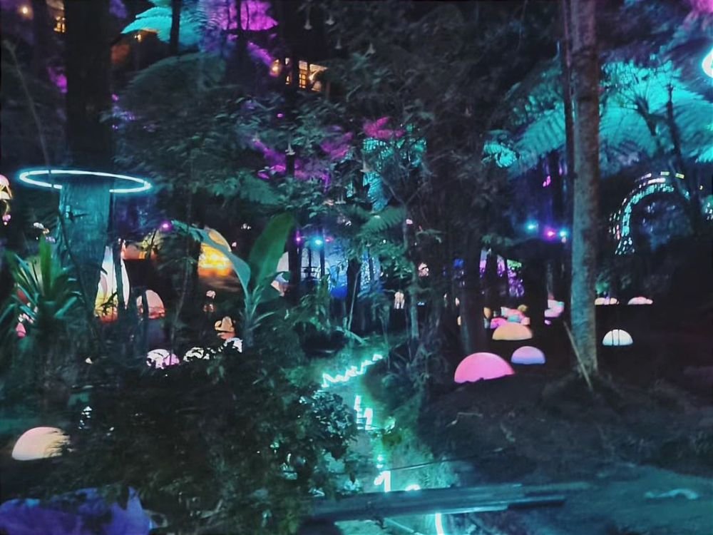 - Menikmati pemandangan pepohonan dan bebatuan yang diberi sentuhan cahaya lampu warna-warni yang menciptakan pengalaman visual yang menakjubkan.