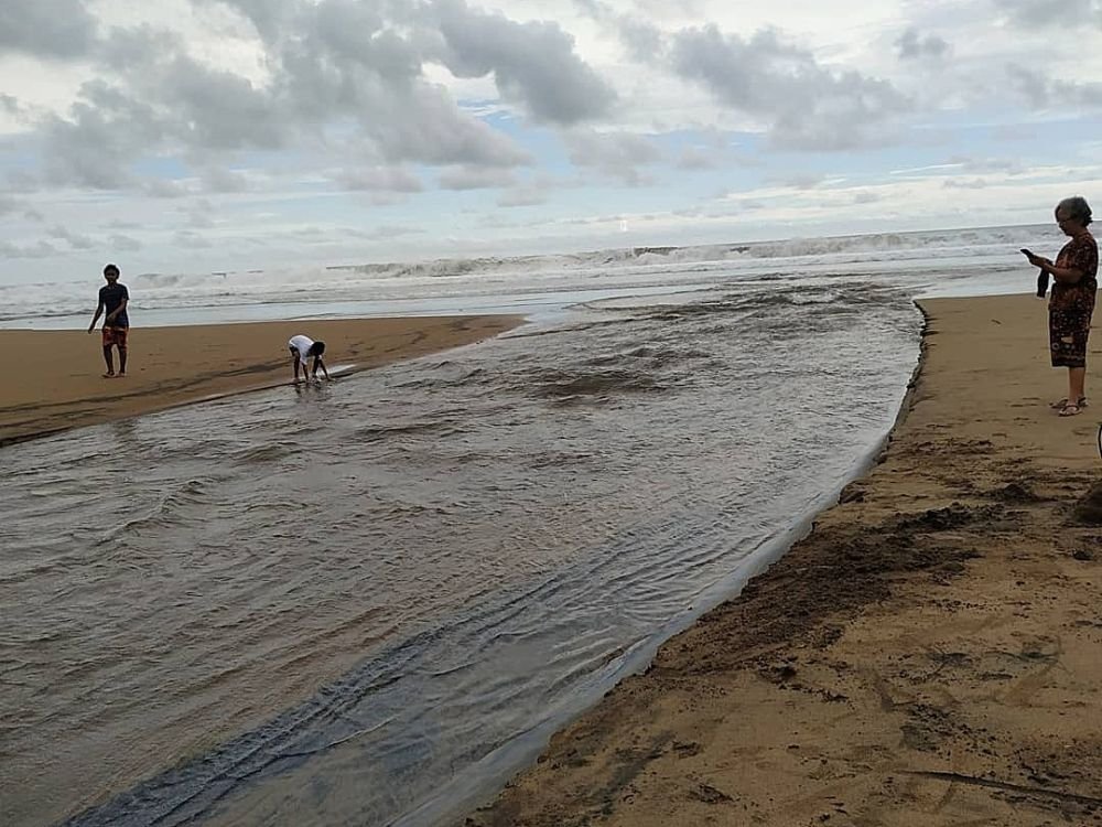 Karena itu, pengunjung yang datang sering kali lebih memilih untuk bermain pasir dan bermain air di aliran sungai yang terhubung ke pantai. Arusnya gak begitu deras dan dangkal, sehingga anak-anak hingga orang dewasa sering kali terlihat menikmati berenang di aliran muara yang terletak di sekitar bibir pantai ini.
