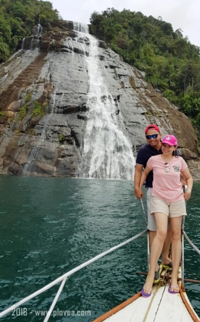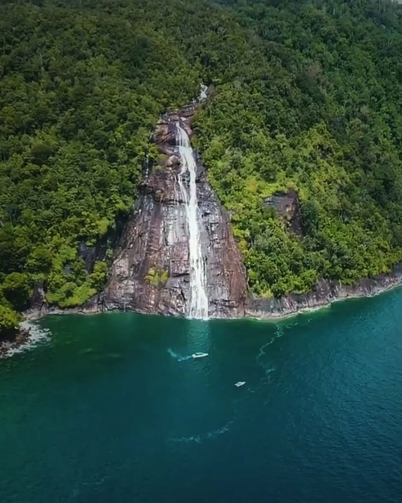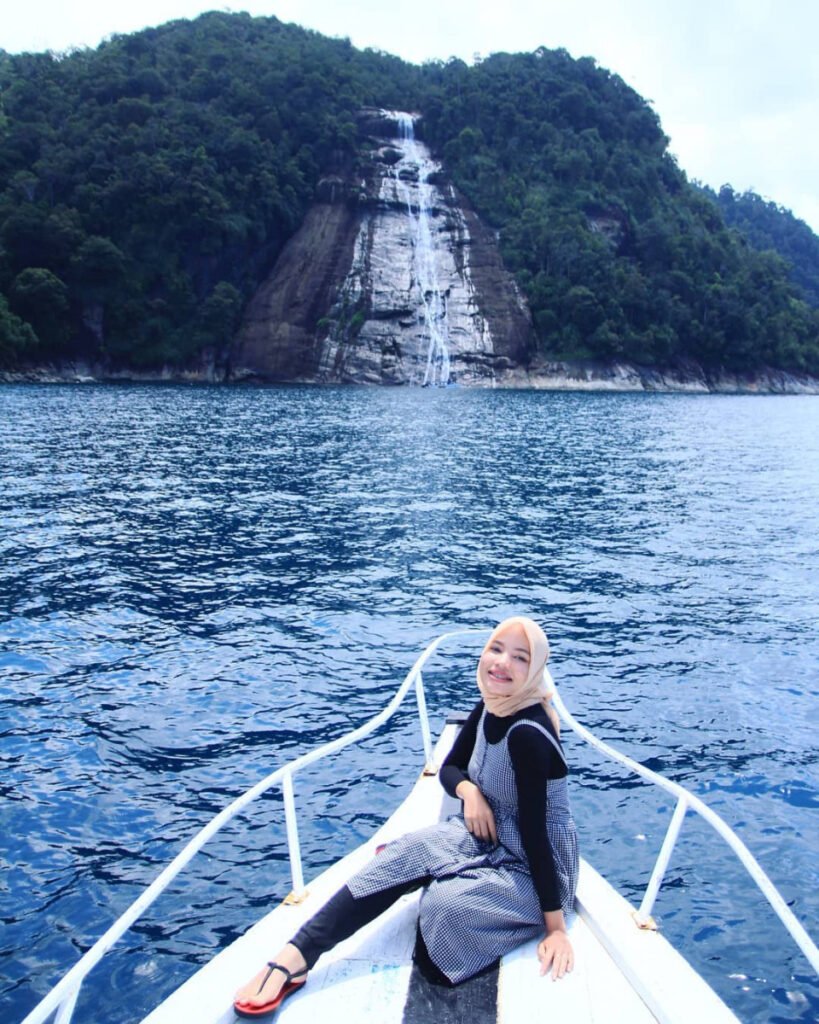Ada yang unik yang dijumpai di pulau iniyakni sebuah air terjun yang langsung airnya terjun langsung ke permukaan air laut.