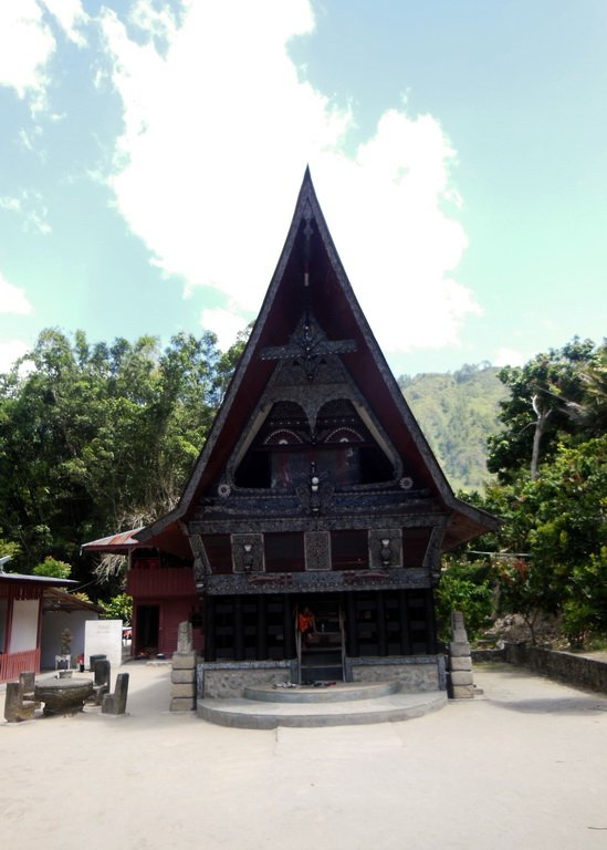 Rumah adat Batak di Tomok ini lokasinya tidak terlalu jauh dari jalan raya Tomok-Tuktuk. Bangunan rumah adat batak berbentuk rumah panggung yang keseluruhan bagunannya terbuat dari kayu dan menggunakan metoda pasak, dimana batang-batang kayu yang menjadi bagian rumah dikunci satu sama lain dengan menggunakan pasak. Dan tanpa paku. Walaupun demikian bangunan rumah adat ini berdiri dengan kokoh dan masih kuat walau sudah berusia cukup lama.