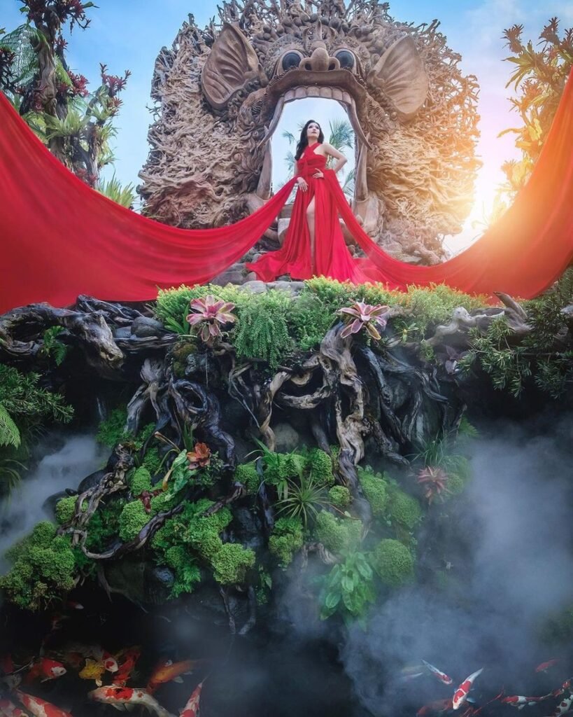 Semua tempat di sini cocok untuk berfoto, tapi ada beberapa spot yang wajib kamu coba, yaitu patung medusa dan mulut kala rau yang terbuat dari akar leci. Di bawah patungnya, ada kolam dengan embun yang akan membuat fotomu semakin keren. Tenang saja, di sini ada petugas yang akan membantumu mengambil foto dan video terbaik.
