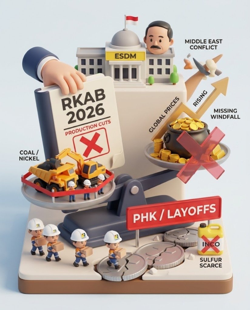 Bloomberg/Kontan – 13 April 2026 – Industri pertambangan Indonesia tengah menghadapi badai sempurna akibat keterlambatan persetujuan RKAB 2026, pemangkasan produksi nasional yang agresif, dan lonjakan biaya operasional. Keputusan pemerintah mengembalikan skema RKAB dari tiga tahunan menjadi tahunan telah menyebabkan kemacetan operasional yang parah di awal tahun. Ditambah lagi, ESDM memangkas target produksi secara drastis, membatasi batu bara di level 600 juta ton (turun 15%) dan memangkas kuota bijih nikel hingga 30%. Akibatnya, kontraktor tambang raksasa seperti PT Pamapersada Nusantara (PAMA) terpaksa mulai melakukan PHK dan penyesuaian tenaga kerja di tengah menyusutnya kuota serta lonjakan biaya bahan bakar yang diperparah oleh ketegangan Timur Tengah dan mandatori B50.
